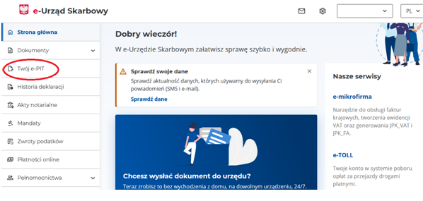 - Po zalogowaniu kliknij w przycisk „Twój e-PIT” widoczny na głównym ekranie.