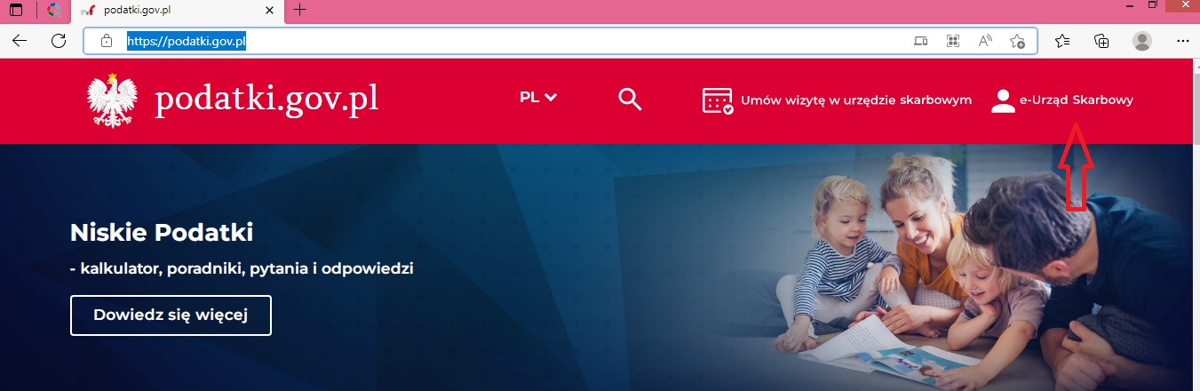 - Na stronie https://podatki.gov.pl/ kliknij w ikonę e-Urząd Skarbowy znajdującą się w prawym górnym rogu.